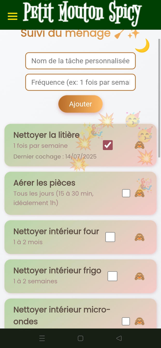 -Liste de tâche et leur fréquence recommandée. En cochant la case lorsque tu as fait la tâche, l'appli enregistre la date, pour que tu saches où tu en es ! Tu peux aussi ajouter des tâches personnalisées.📋Adapter ton environnement à toi (et pas l'inverse !)
